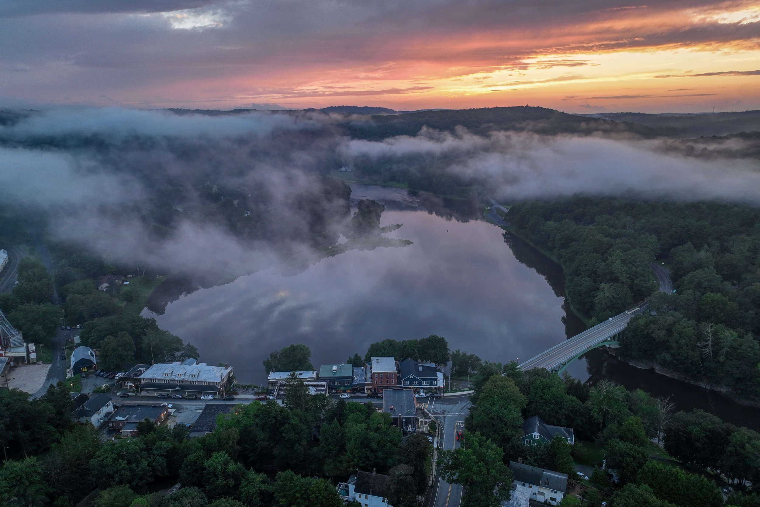 Aerial view of the hamlet of Narrowsburg, picturesquely set on the Delaware River. The Narrowsburg–Darbytown Bridge connects to Pennsylvania. Photo: Erik Freeland